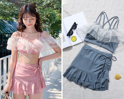 スイムウェア レディース 短パン セパレート クロスバンド ベルスリーブ レース チュール 上下セット かわいい カジュアル ナチュラル おしゃれ 存在感 ガーリー 個性的 無地 リゾート 旅行 温泉 プール 夏 海 ビーチ 10代 20代 背中見せ インスタ映え M L XL ピンク シルバーグレー