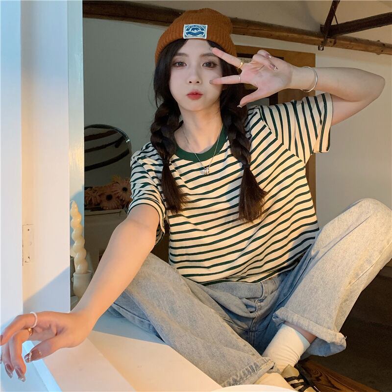レディース トップス Tシャツ レギュラー丈 半袖 レギュラースリーブ クルーネック ストレート プルオーバー リブ コットン カジュアル レトロ スポーティー 存在感 カレッジ風 ストライプ 夏 お出かけ アウトドア キャンプ イベント 海 プール 公園 女子会 休日 ショッピング コンサート ライブ カフェ 普段使い 定番 M L XL グリーン