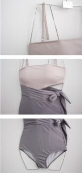 こちらの「水着 」は、シンプルでありながら大人可愛い印象を与える魅力的なデザインです!ウエストをリボンでマークすることで、スタイルアップを実現し、脚長効果も期待できる優れた一着です。無地の紫やオフホワイトは、リゾート地や夏のビーチでの主役級アイテムとなります。