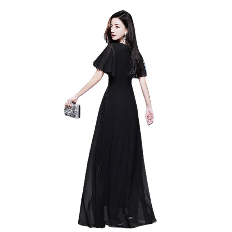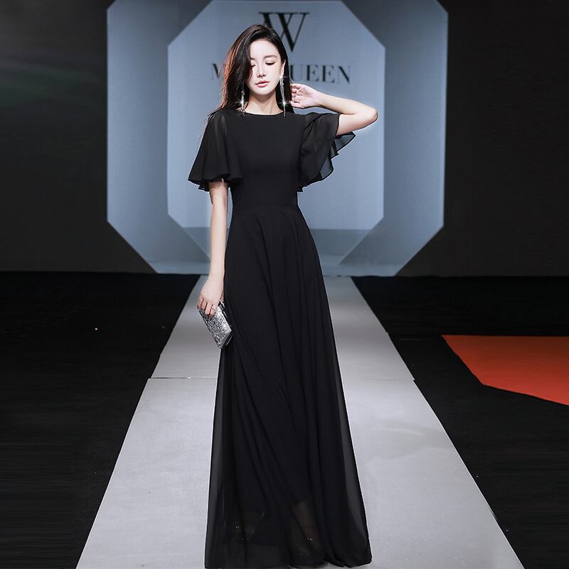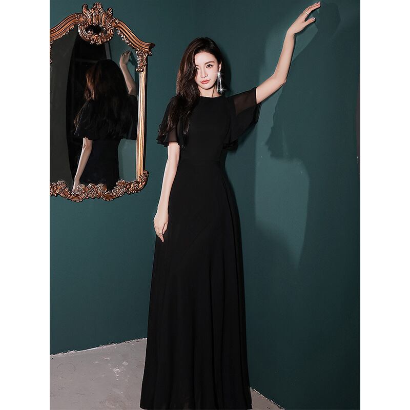ドレス パーティー 演奏会 発表会 ステージ 舞台 演劇 ロング 長袖 プリンセススリーブ クルーネック スリム フレア Aライン イブニング プリーツ シフォン ハイウエスト 透け感 薄手 きれいめ シンプル 上品 エレガント 主役級 存在感 清楚 無地 パーティー イベント ホテル レストラン シーズンレス S M L XL 2XL 黒