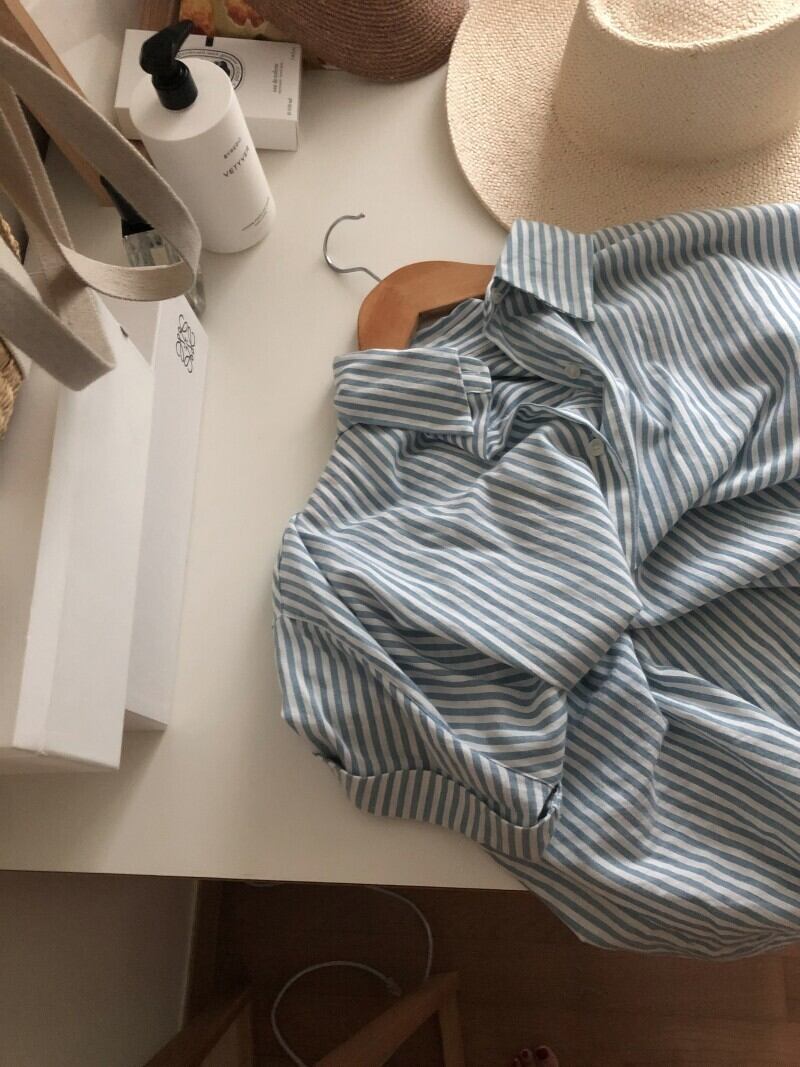 レディース ワンピース シャツワンピ ロング 半袖 ポロカラー ストレート 薄手 コットン スプライシング シンプル カジュアル 個性的 シック リラックス ストライプ 夏 ロングシーズン OL 通勤 お出かけ アウトドア キャンプ イベント リゾート 海 プール ビーチ 公園 女子会 休日 ショッピング カフェ 楽ちん 普段使い ゆったり フリーサイズ グレーブルー