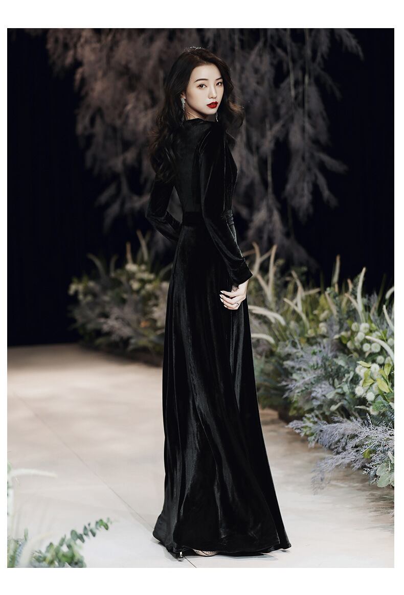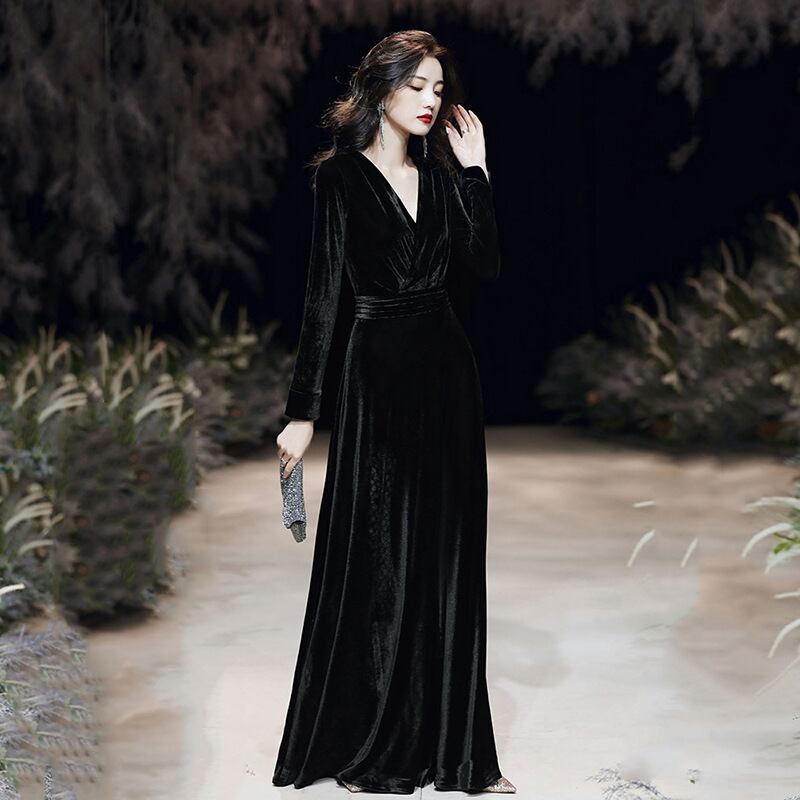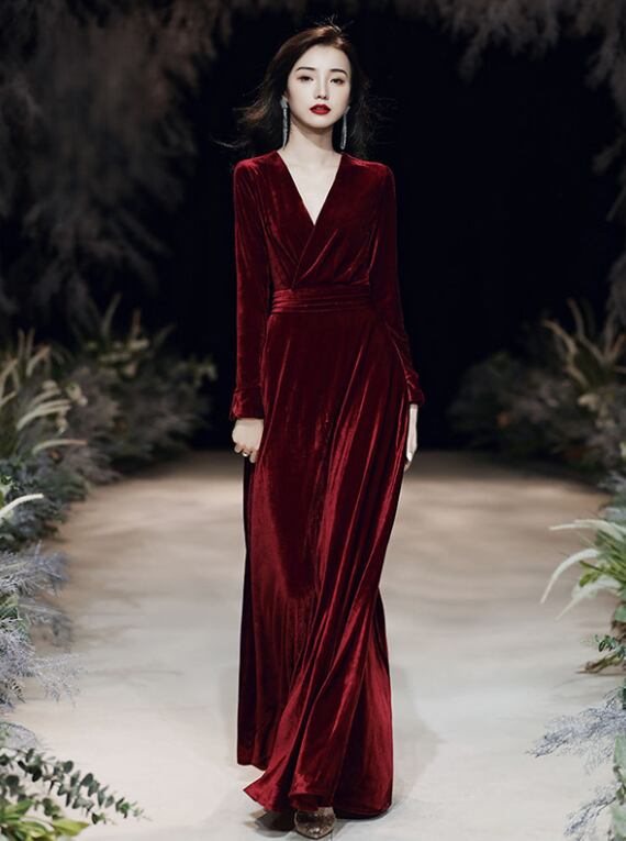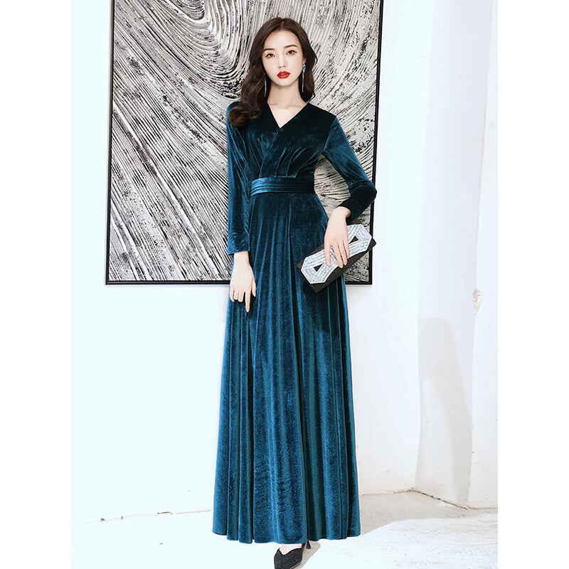 ドレス パーティー 二次会 演奏会 発表会 ステージ 舞台 ロング 長袖 Vネック マーメイド スレンダー アシンメトリー Aライン イブニング プリーツ ベルト スリット ハイウエスト ベルベット 上品 おしゃれ アジアン エレガント 主役級 存在感 無地 パーティー イベント リゾート ホテル レストラン 夏 S M L XL 2XL 3XL 黒 バーガンディ ダークグリーン ピーコックブルー