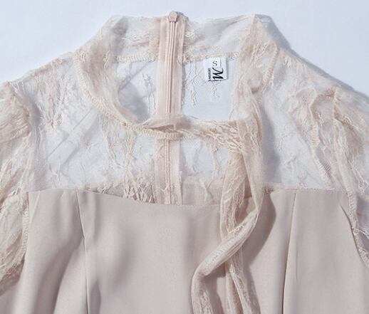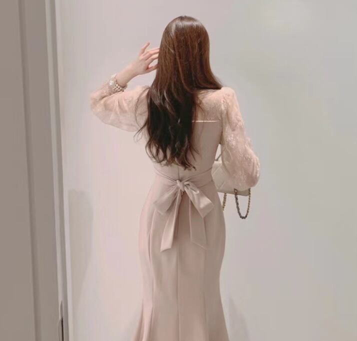 ドレス パーティー 披露宴 演奏会 発表会 舞台 ミディアム丈 長袖 ランタンスリーブ クルーネック マーメイド 細身 イブニング レース リボン 切り替えデザイン 透け感 薄手 ポリエステル繊維 上品 おしゃれ エレガント 主役級 存在感 花柄 無地 パーティー イベント リゾート ベトナム風 秋 S M L 黒 ピンク