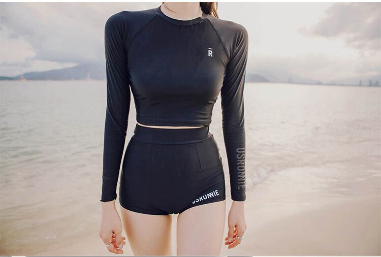 水着 スイムウェア レディース 体型カバー ラッシュガード 短パン セパレート 長袖 ホールド感 安定感 上下セット シンプル カジュアル おしゃれ クール スタイリッシュ 無地 リゾート 旅行 温泉 プール 夏 海 ビーチ 日除け M L XL ブラック
