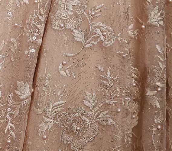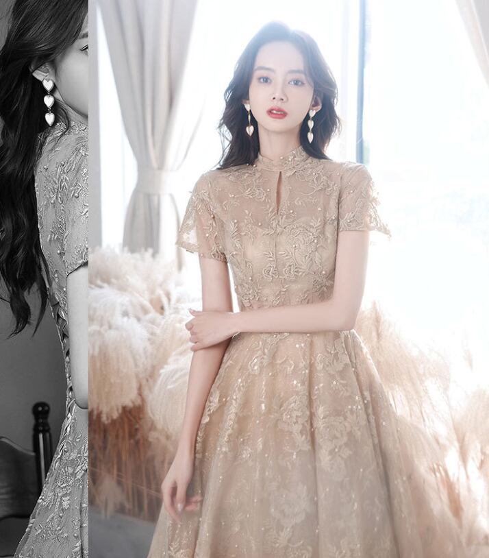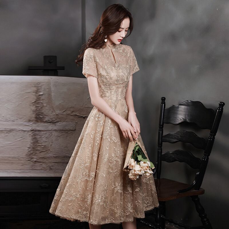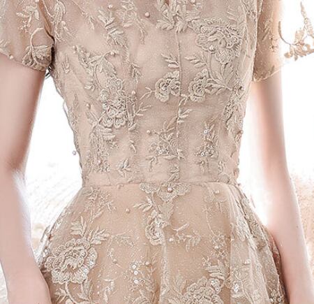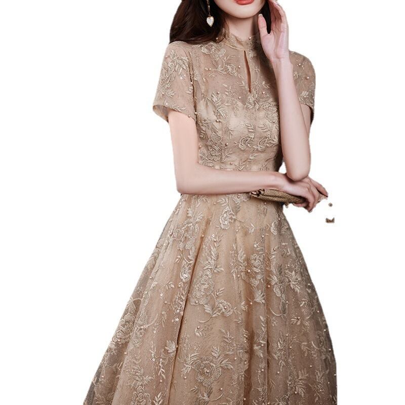 ドレス パーティー 二次会 演奏会 発表会 ステージ 謝恩会 ロング ミディアム丈 半袖 レギュラースリーブ ハーフネック プリンセスライン Aライン イブニング プリーツ レース 刺繍 ファスナー ハイウエスト 厚手 ポリエステル繊維 きれいめ 上品 おしゃれ エレガント 存在感 清楚 花柄 パーティー イベント リゾート ホテル レストラン 冬 XS S M L XL 2XL 3XL シャンパン