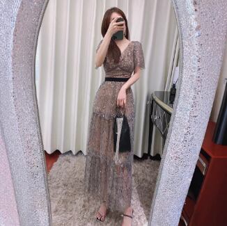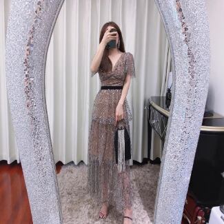 ドレス パーティー 演奏会 ステージ 舞台 ダンス 衣装 コスプレ クラブ ロング 半袖 Vネック 襟なし パッチワークスタイル レース ウエストマーク ファスナー ハイウエスト スパンコール ビーズ メッシュ刺繍 ポリエステル繊維 きれいめ 大人可愛い おしゃれ エレガント 存在感 エレガント 華やか 無地 スパンコール パーティー イベント 光沢感 夏 パーティー 演奏会 舞台 演劇 キャバ クラブ XS S M L XL グレー